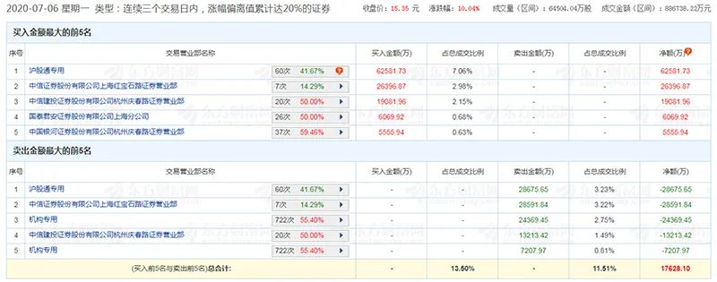 7月2日至6日,国金证券(16.260,-0.22,-1.33%)股价连续三日涨停。昨日,交易所公布了国金证券这三日的连续榜单。