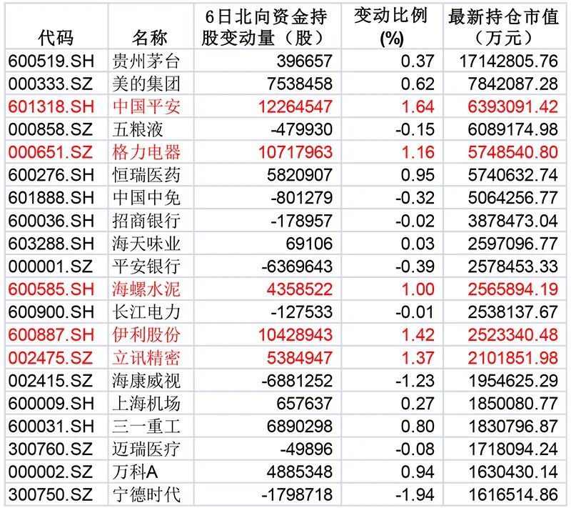 具体个股方面,北向资金前二十大重仓股中,有5只个股昨日北向资金持股数量增长超过1%,分别是中国平安(84.720,-1.20,-1.40%)、格力电器(60.280,0.46,0.77%)、海螺水泥(58.110,-1.13,-1.91%)、伊利股份(35.050,0.03,0.09%)与立讯精密。